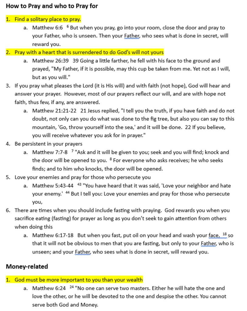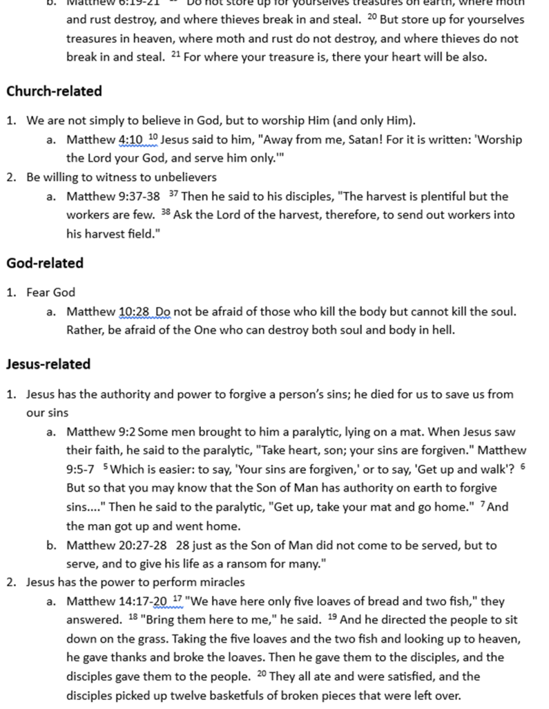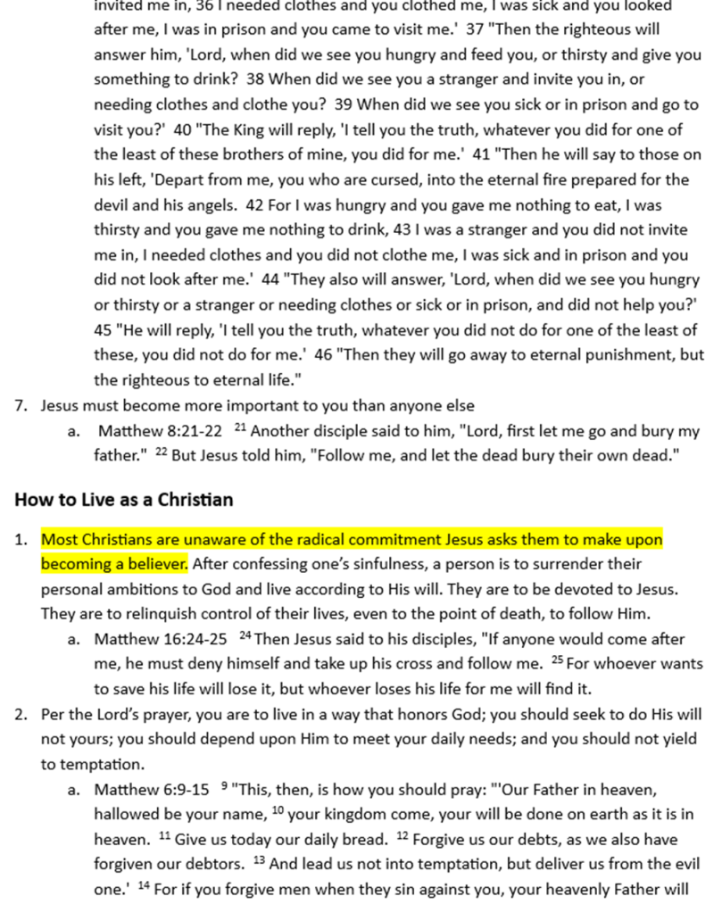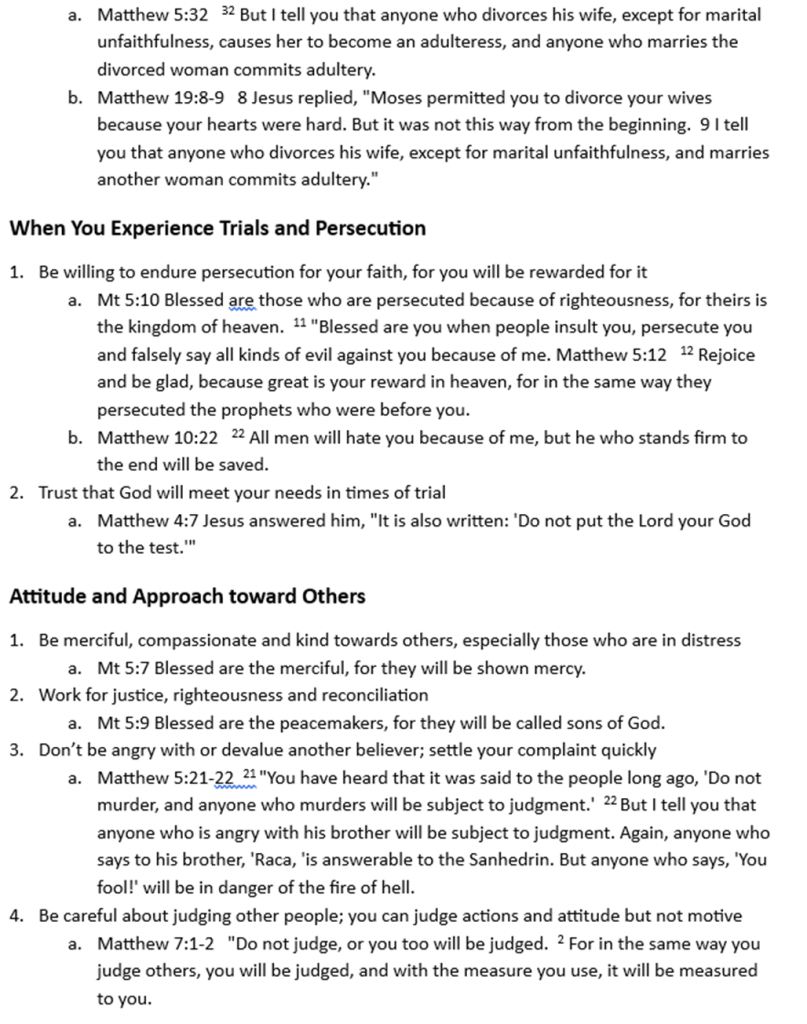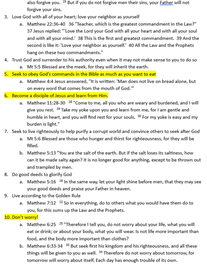 I used a “red letter Bible” to review the book of Matthew and identify every verse where Jesus spoke about how a person becomes a Christian and how a Christian should live. I then grouped these into categories and highlighted issues that stood out the most to me. Yes, this post is long, but think of it as a reference or checklist you can use to help you determine if you are a genuine Christian, and then how you should live (as a Christian) according to Jesus.
