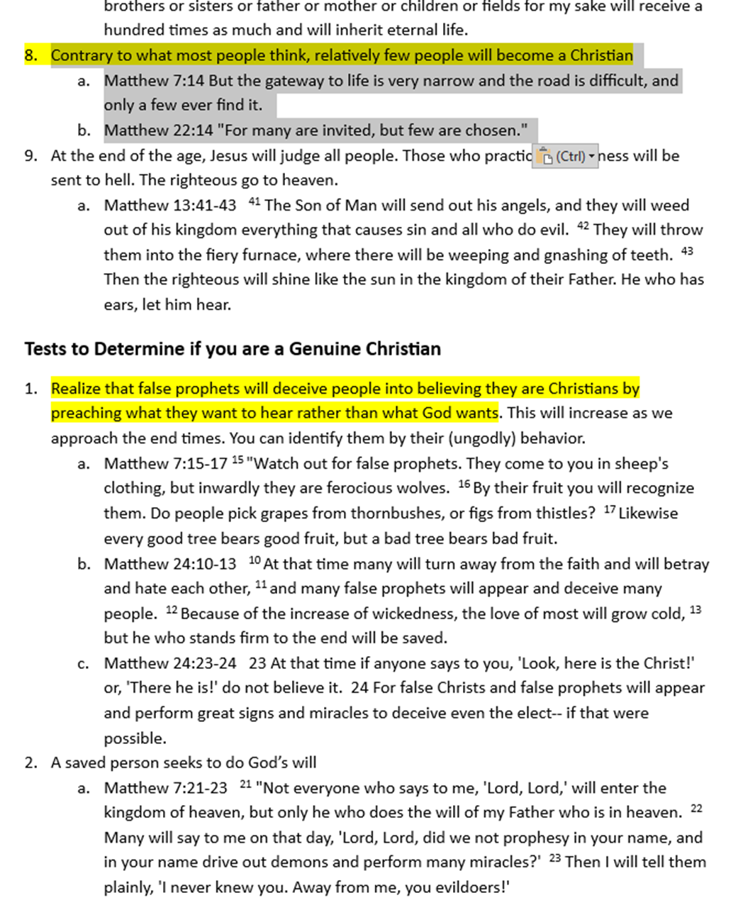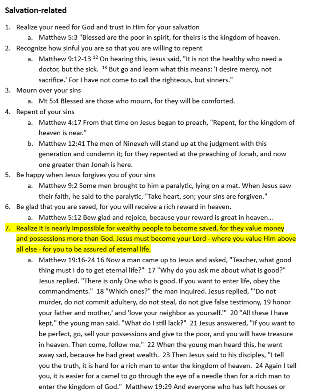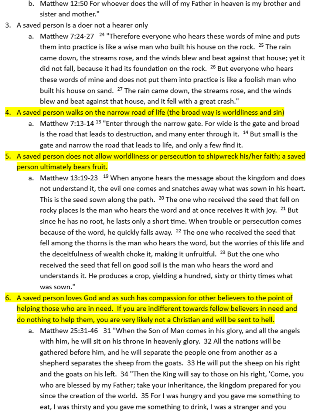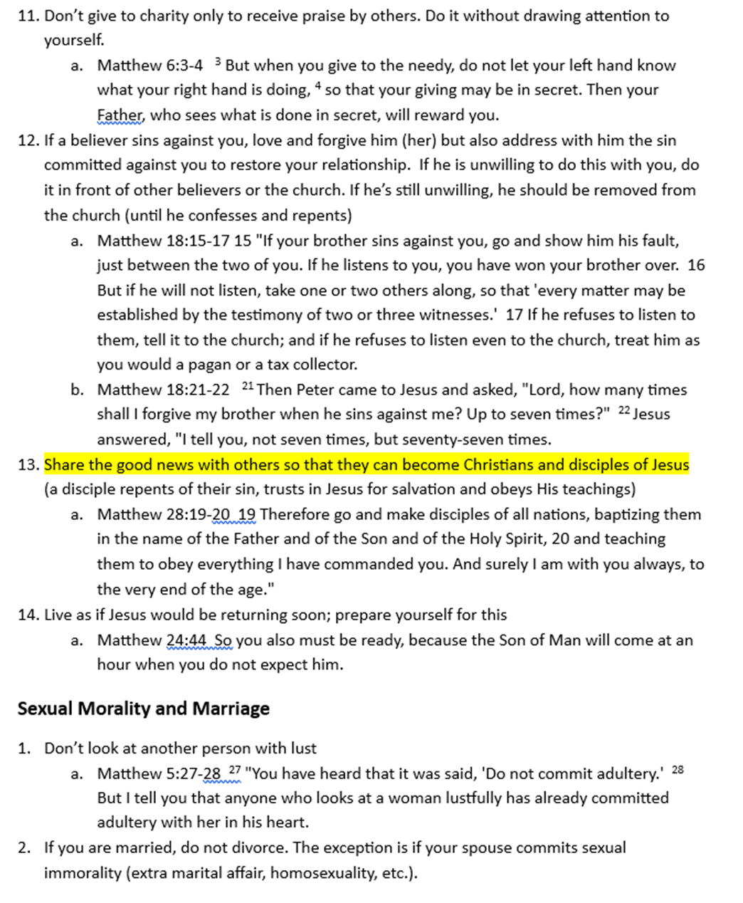 I used a “red letter Bible” to review the book of Matthew and identify every verse where Jesus spoke about how a person becomes a Christian and how a Christian should live. I then grouped these into categories and highlighted issues that stood out the most to me. Yes, this post is long, but think of it as a reference or checklist you can use to help you determine if you are a genuine Christian, and then how you should live (as a Christian) according to Jesus.