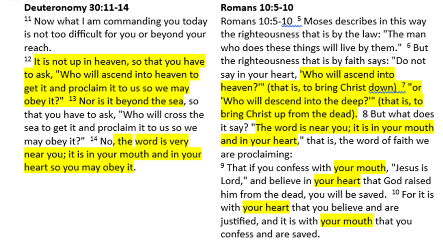 First, it’s important to note that several of the phrases and terms Paul uses in Romans 10 come from Deuteronomy, as shown below. Why Paul chose to do it this way I’m not sure other than to possibly appeal to the Jews in his audience, for they likely knew Deuteronomy well and if Paul could tie some Old Testament verses to salvation in the New, that might help convert some of the Jews, which is what he desperately wanted (see Romans 10:1).